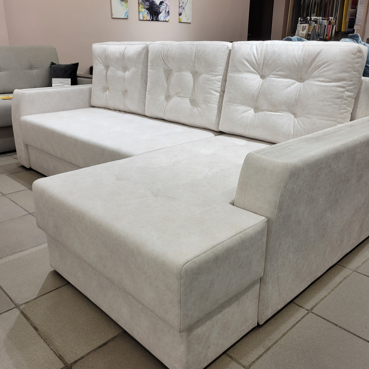 В данный момент на образце стоит велюр, который несмотря на белый цвет, очень практичный и легкий в уходе. Под заказ конечно Вы можете выбрать любую обивку.
